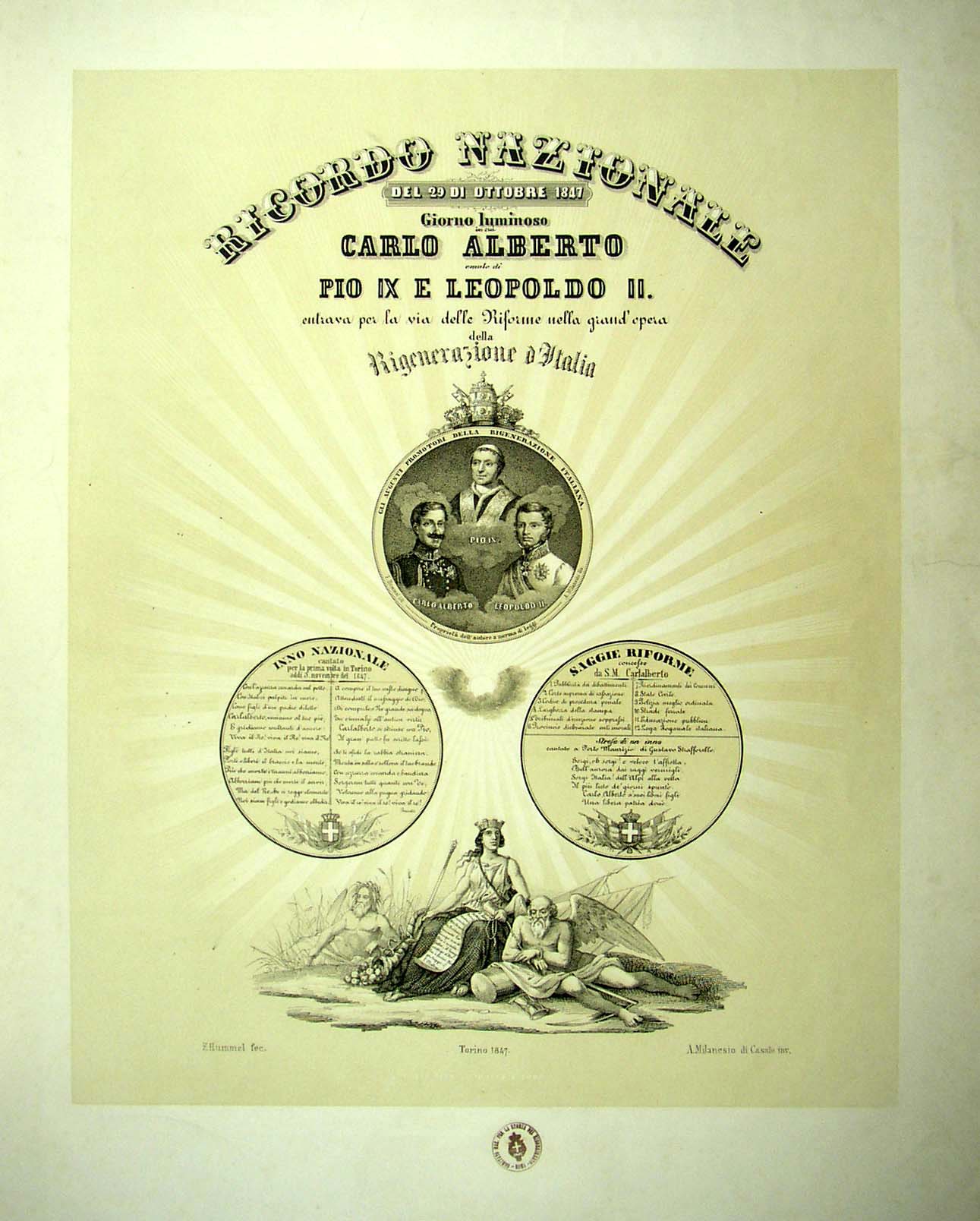Nel medaglione centrale sono raffigurati Pio IX, Carlo Alberto e Leopoldo II  quali ‘promotori della rigenerazione italiana’. In basso è presente l’Italia turrita con cornucopia e bastone del comando.