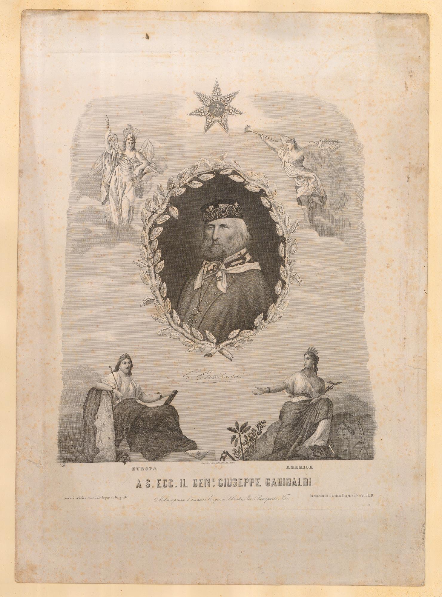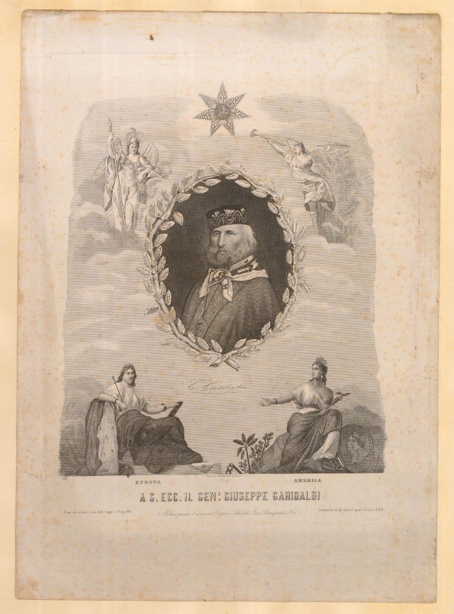 Il ritratto di Garibaldi è accompagnato dalle allegorie femminili di Europa (a sinistra) e America (a destra).