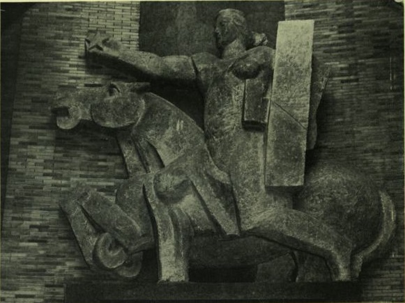 L’Italia è a cavallo, priva di corona turrita. Stringe nella mano destra lo stellone e nella sinistra stringe a sé uno scudo-fascio littorio. La scultura fu eseguita da Antonio Majocchi e Ruggeri su disegno di Mario Sironi.