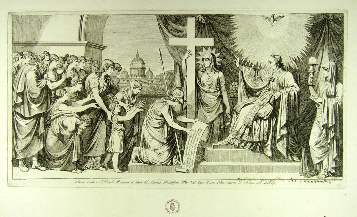 La figura femminile di Roma indossa tunica ed elmo; si inginocchia di fronte a Pio VII dopo il suo ritorno a Roma nel 1814. In calce: “Roma conduce il Popolo Romano ai piedi del Sommo Pontefice dopo il suo felice ritorno in Roma nel 1814”.