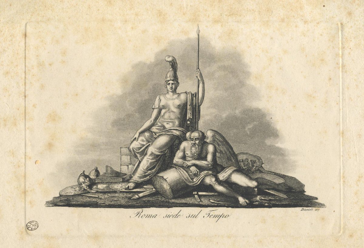 Roma con capo cinto da un elmo e con indosso una corazza siede su antiche rovine. Sotto di lei l’allegoria del Tempo.