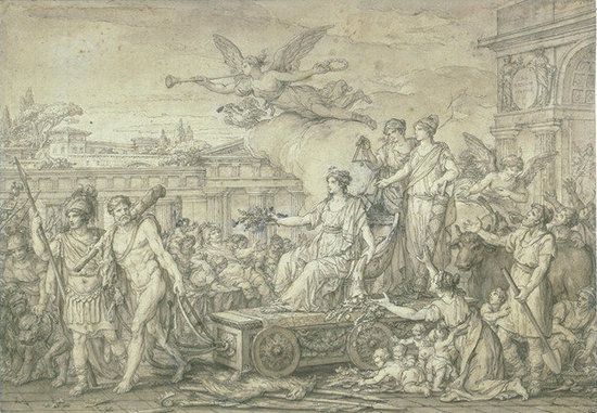 Composizione neoclassica; un carro è appena passato sotto un arco di trionfo romano; un palazzo dorico e le toghe che vestono dei e figure allegoriche, richiamano lo stile…