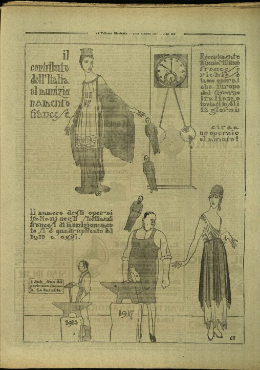 La Francia-Marianne ferita e in guerra ascolta con il sorriso in volto il discorso di D’Annunzio. In calce: “MARIANNA :- Beato voi, signor Gabriele, che siete sempre allegro”.