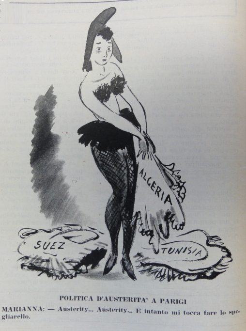 La Francia-Marianne è costretta a fare lo spogliarello per far fronte alla politica di rigore dello Stato. In calce: “Marianna:-Austerity…Austerity…. E intanto mi tocca fare lo spogliarello”.