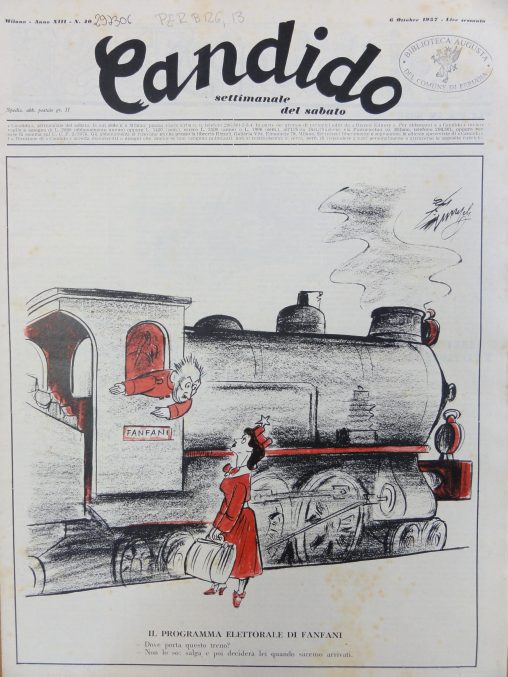 L’Italia turrita e stellata chiede al capotreno Fanfani la destinazione del convoglio. In calce: “- Dove porta questo treno? – Non lo so: salga, e poi deciderà lei…