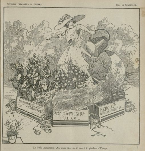 L’Italia turrita indossa i panni della giardiniera, intenta ad annaffiare i fiori che rendono grande il Paese; mentre appassiscono alcune piante, con poche qualità per affrontare il periodo…