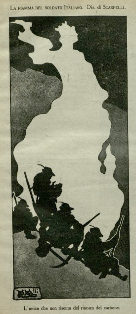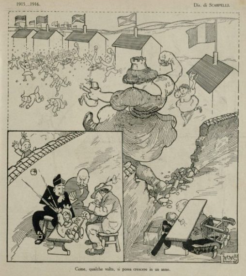 L’Italia turrita è raffigurata in teatro ad assistere ad uno spettacolo di Nicola Maldacea, che porta in scena lo sbruffone tedesco. In calce: “LO SBRUFFONE (tedesco): Io sfondo…
