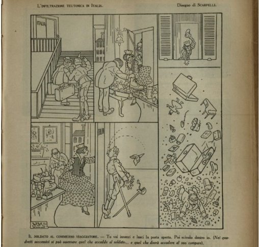 Un saldato dell’Impero germanico cerca di entrare in casa dell’Italia turrita, sfruttando un commesso viaggiatore che sta per bussarle alla porta. In calce: “IL SOLDATO AL COMMESSO VIAGGIATORE…