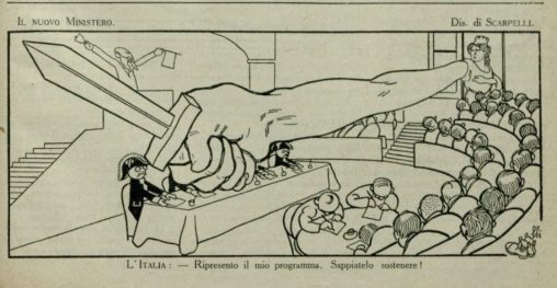 Giovanni Giolitti tiene fuori della porta della “tribuna pubblica” l’Italia turrita. In calce: “L’USCIERE GIOVANNI: – Mi rincresce, Signora, ma se entra Lei, mandano via me…”.