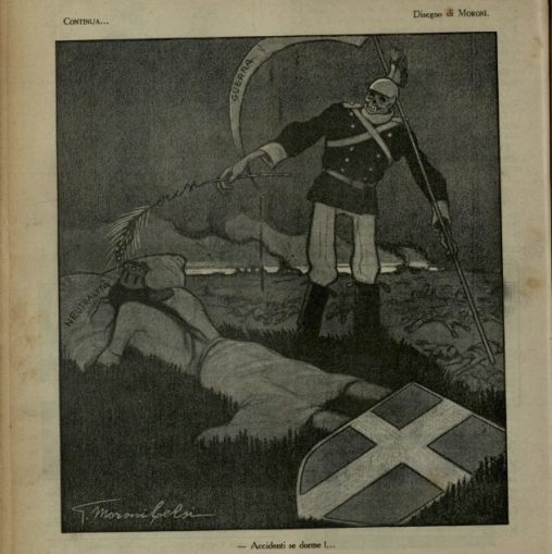 L’Italia turrita è riversa a terra, prona, con il volto appoggiato sul cuscino della “neutralità”. L’allegoria della guerra tenta di svegliarla con una spiga di grano, su cui…