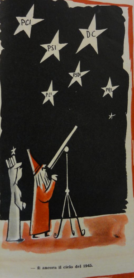 L’Italia turrita osserva insieme ad una mago le stelle del cielo, “PCI”, “PSI”, “DC”, “PLI”, “PSDI”, “PRI”. In calce: “È ancora il cielo del 1945”. La vignetta fa…