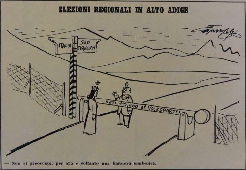 L’Italia turrita e stellata è al confine con il Trentino Alto Adige; il confine è sbarrato dai voti ottenuti dal Südtiroler Volkspartei. In calce: “Non si preoccupi: per ora…