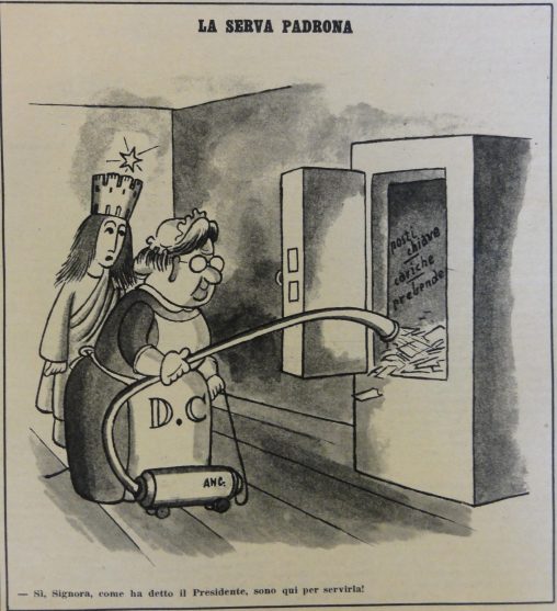 L’Italia turrita e stellata osserva perplessa una DC-collaboratrice domestica che con un’aspirapolvere ripulisce una cassaforte piena di “posti chiave, cariche, prebende”. In calce: “- Sì, Signora, come ha…