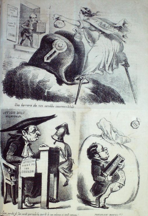 Serie di vignette. Prima vignetta: la Francia indossa i trampoli e, cercando di superare il capello di Napoleone III, porta dei sacchi di denaro a Daniele Manin, che…