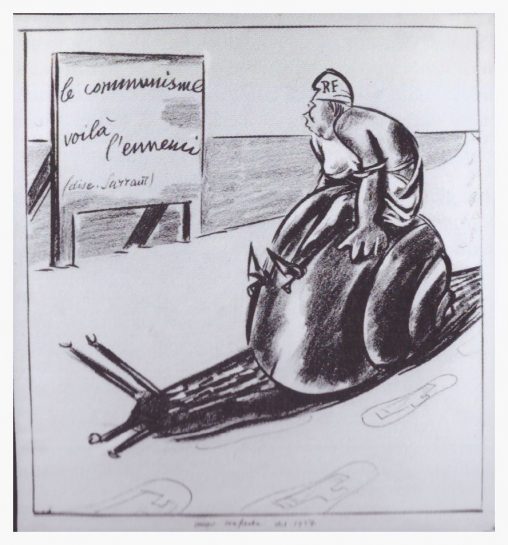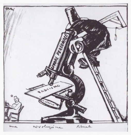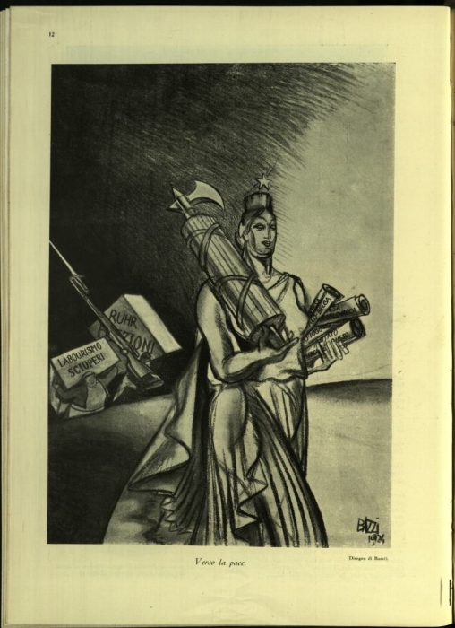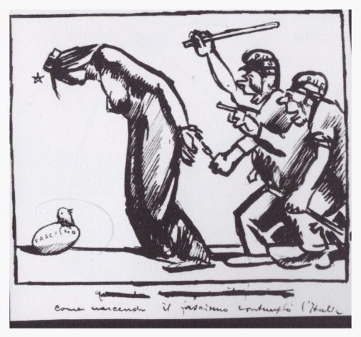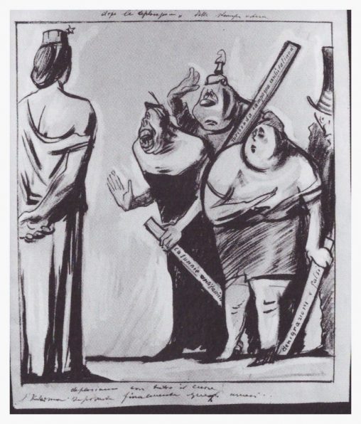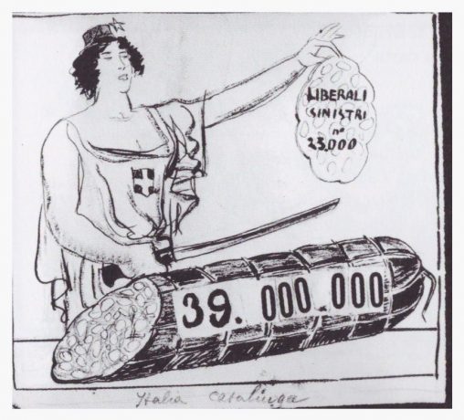 L’Italia ha due sembianze: quella turrita e stellata dell’Italia fascista, con due sacchi pieni d’oro in mano, e quella socialista con berretto frigio, che rappresenta Nitti stesso, con…