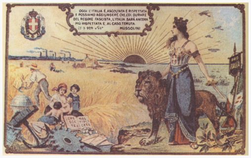 L’Italia turrita vigilia, accompagnata da un leone, su floridi campi di grano. Sullo sfondo il sole che sorge e fabbriche. In testa alla cartolina: “Oggi l’Italia è ascoltata…