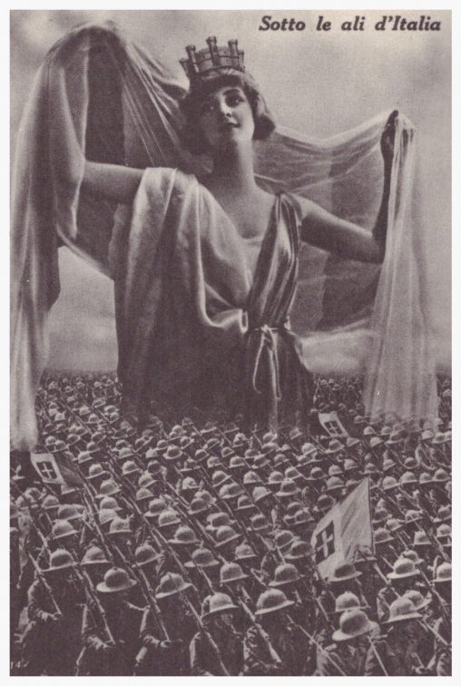 La donna/madre italiana, che rappresenta l’Italia come madre comune marcia insieme ai soldati italiani, tenendo per mano un bambino. In calce: “La donna italiana, colle sue rinunce e…