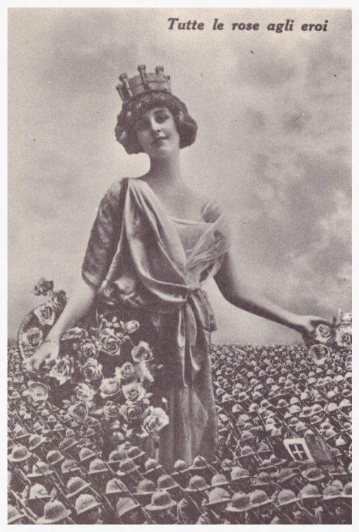 L’immagine dell’Italia turrita e stellata che si appoggia sul fascio littorio; a i suoi piedi Carlo Delcroix, militare italiano decorato della Medaglia d’Argento al Valore Militare, rimasto mutilato…