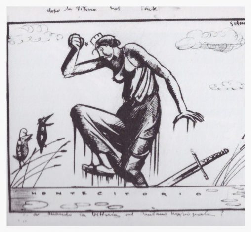 Numerosi buoni del tesoro sfondano reticolati di filo spinato; la Vittoria con il fascio littorio fra i capelli, il gladio nella mano destra e una corona d’alloro nella…