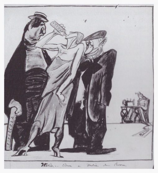 In primo piano la figura femminile dell’Italia licenziosa, dedita al bere; mentre sullo sfondo è rappresentata l’Italia turrita e stellata, ovvero l’Italia fascista, dedita al lavoro.