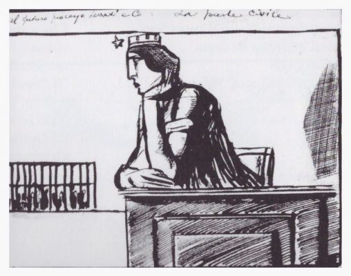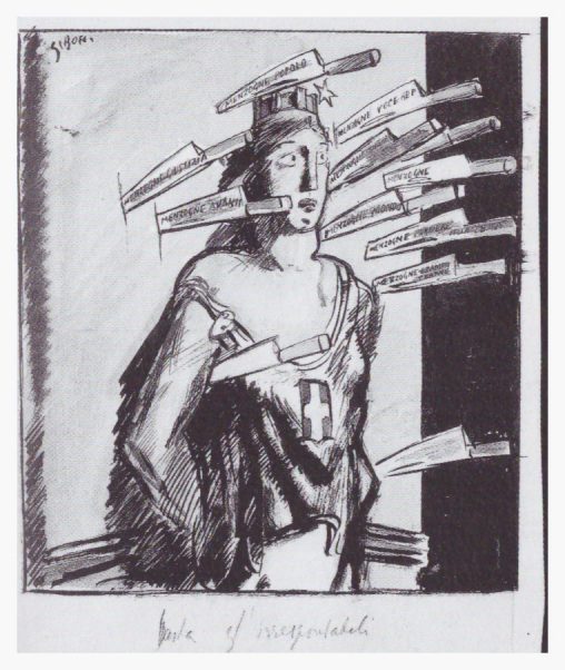 L’Italia turrita e stellata si torva in tribunale essendosi costituita parte civile per essere risarcita dagli errori passati. L’inscrizione in alto riporta: “al futuro processo Serrati e Co.:…