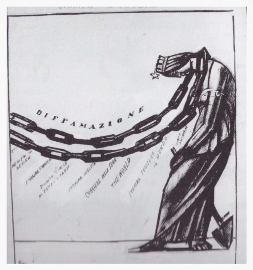 L’Italia turrita e stellata è vittima di un lancio di coltelli, i quali rappresentano ciascuno le menzogne della carta stampata d’opposizione. In quei giorni erano stati messi in…