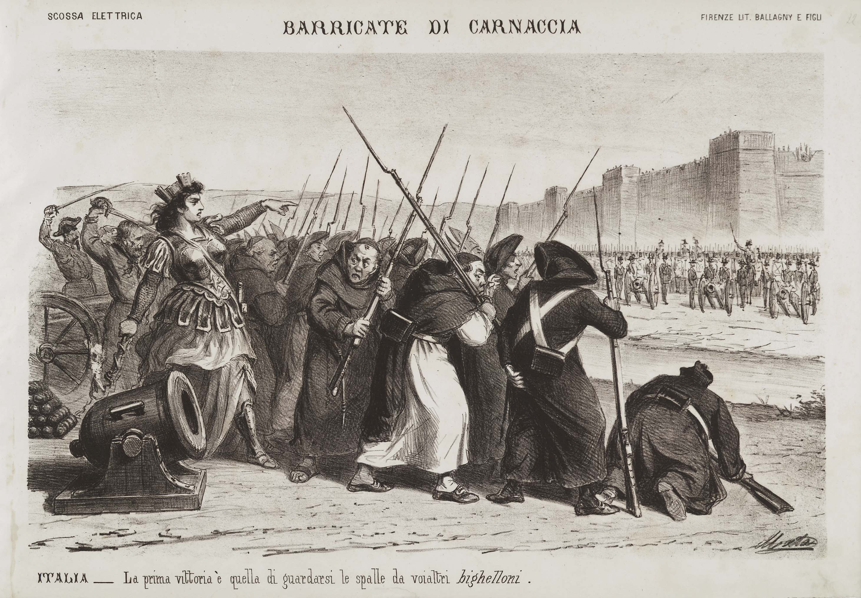 L’Italia turrita con armatura sta per dare fuoco alle polveri, incitando l’esercito e redarguendo gli ecclesiastici scansafatiche. In calce: “ITALIA – La prima vittoria è quella di guardarsi…