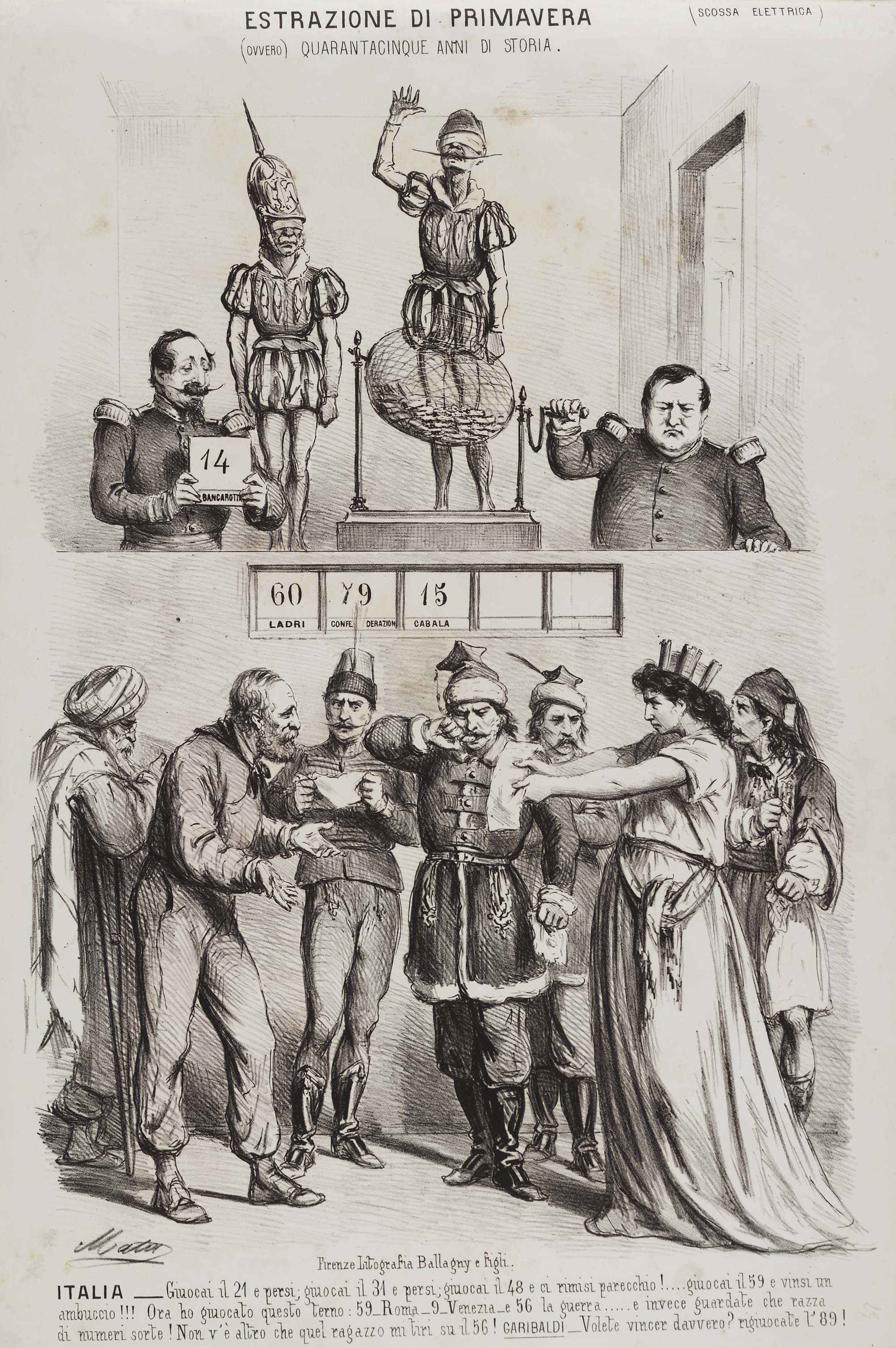 L’Italia turrita mostra, scura in volto, i numeri giocati che cronologicamente corrispondono ad azioni intraprese per l’unificazione del Paese. In calce: “ITALIA – Giuocai il 21 e persi;…
