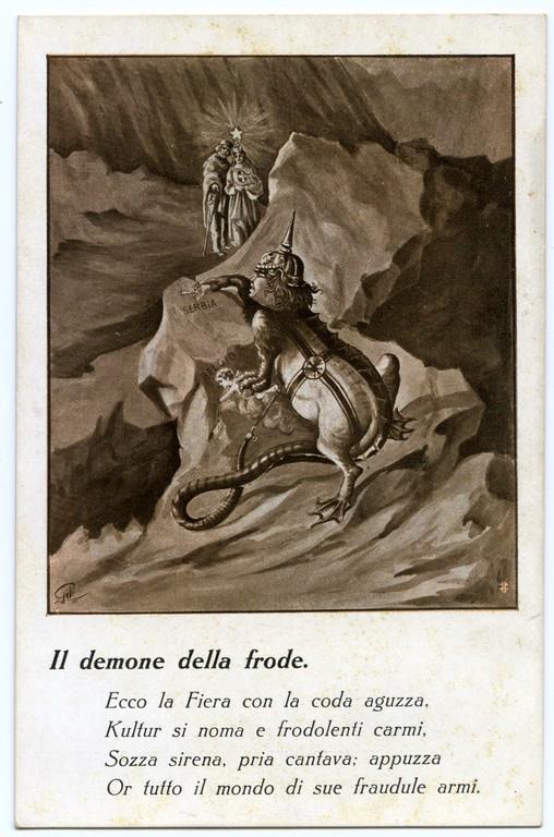 Satira sull’intervento dell’Italia alla I guerra mondiale ispirata alla Divina Commedia di Dante (Inferno, XXVIII, 31-33). L’Italia turrita avvolta dalla bandiera italiana con scudo dei Savoia è a…