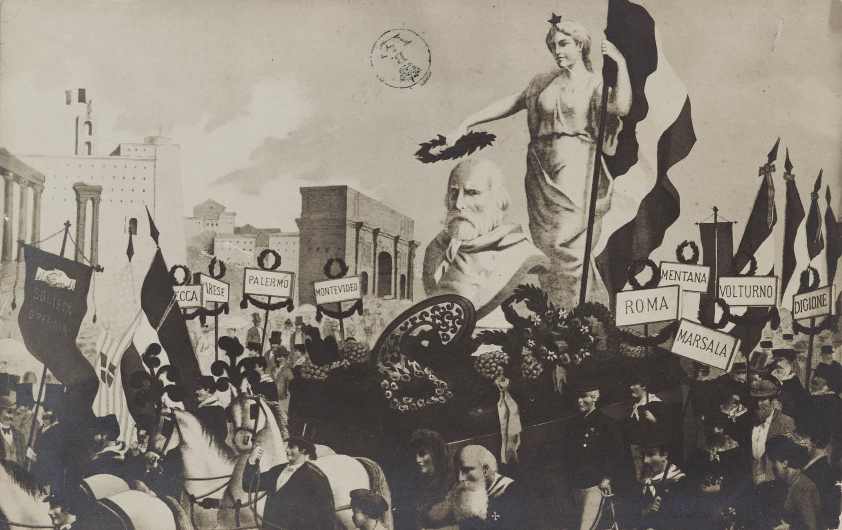 L’Italia stellata, ma non turrita, recante il tricolore in mano, porge al busto di Garibaldi una corona d’alloro. Sui cartelli i nomi dei luoghi legati alle imprese garibaldine:…