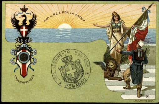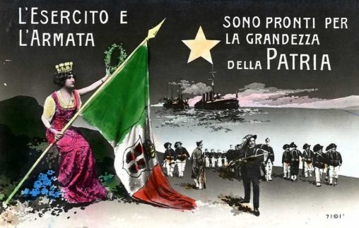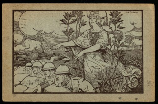 L’Italia turrita è qui rappresentata come madre. Sul retro della cartolina si legge: “La buona madre Italia, mentre la lotta imperversa al di fuori sta rinchiusa nella sua…