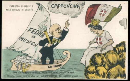 Gabriele D’Annunzio sbarca a Quarto su una piccola barca con alcune sue opere: (La nave, Guanti di Parigi) e tre sacchi contenenti oro. Sulla vela sta scritto “Fedra…