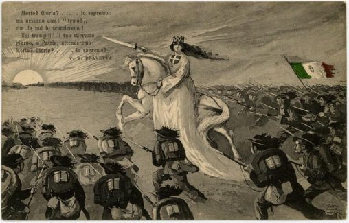 L’Italia turrita guida l’assalto dei bersaglieri. In alto a sinistra il testo in versi di V.E. Bravetta: “Morte? Gloria? … Lo sapremo: / ma nessuno dica: ‘temo’! /…