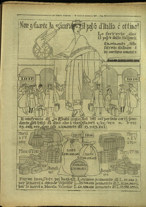L’Italia turrita poggia la mano destra su una ruota di treno dotata di ali. Il riferimento è al sistema ferroviario del paese, che vede aumentare il numero di…
