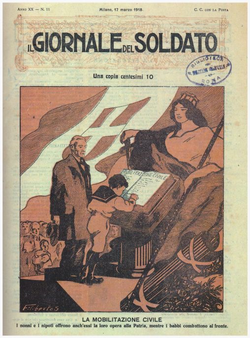 L’Italia turrita osserva come tutti gli italiani, indipendentemente dall’età, concorrano a sostenere la patria. In calce: ” I nonni e i nipoti offrono anch’essi la loro opera alla…