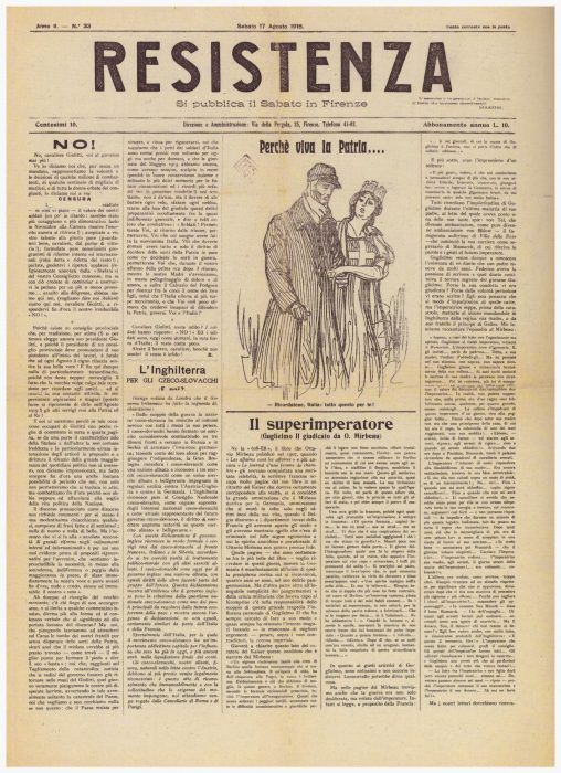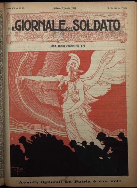Sulla copertina dell’opuscolo è raffigurata la Patria/Italia con il capo cinto da una corona d’alloro e con indosso una corazza con scudo sabaudo. Nella mano destra impugna il…