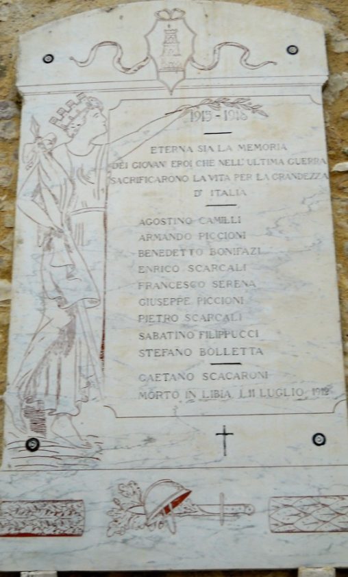 Sulla lapide a ricordo dei giovani caduti nella Grande Guerra è incisa la figura dell’Italia turrita con una bandiera stretta al fianco e con in mano un ramoscello di…