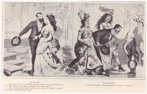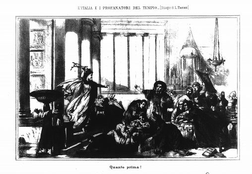 Nella serie di vignette, sulla sinistra, Roma/Italia veste i costumi tradizionali ciociari. È tenuta legata ad un capitello antico da Napoleone III, mentre il pontefice in abito gesuitico la…