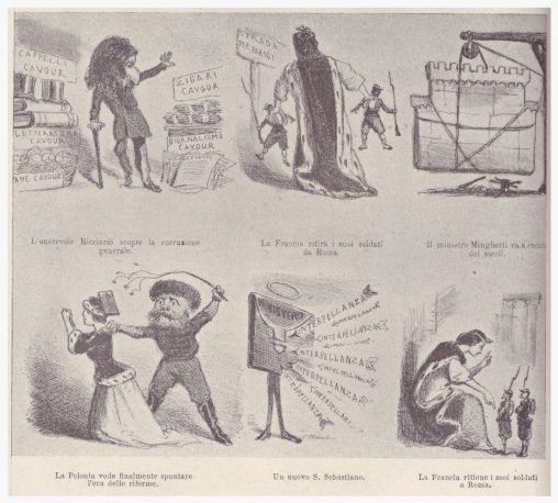 La serie di vignette si riferisce ad alcuni episodi del secondo trimestre del 1861. Nella seconda e terza vignetta è rappresentata la Francia che temporeggia nel togliere i…