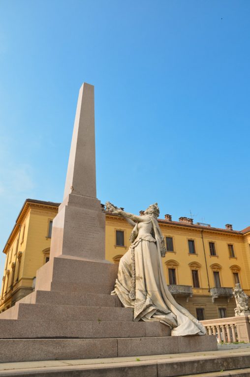 L’Italia con corona turrita reca con sé una corona d’alloro. Il monumento fu eretto in occasione del cinquantesimo anniversario dello Statuto Albertino.