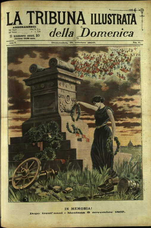 Una figura femminile vestita a lutto, che rappresenta probabilmente l’Italia, pone delle corone d’alloro sul monumento che celebra i soldati garibaldini caduti a Mentana.