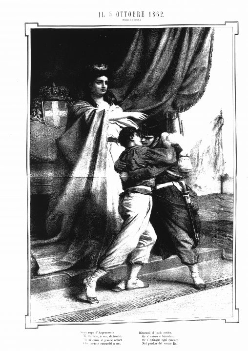 L’Italia turrita accoglie a sé e benedice un soldato garibaldino e un soldato regolare. (L’immagine qui riprodotta è pressoché identica ad un’altra archiviata come “Allegoria dell’Italia unita”).