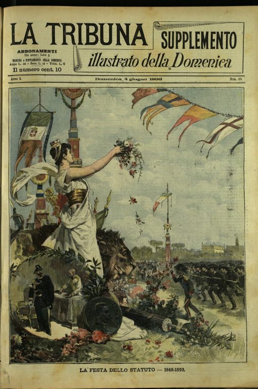 La copertina celebra il plebiscito che sancì l’annessione al Regno d’Italia di Roma, dopo la breccia di Porta Pia. In primo piano, Roma che si inginocchia davanti a Vittorio…