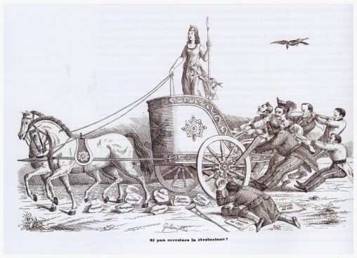 L’allegoria femminile della rivoluzione indossa il berretto frigio e guida altera una biga, passando sopra gli ostacoli che trova lungo il percorso (privilegi, imposte, monopoli, Santa Alleanza, Congressi…)…