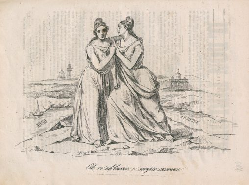 L’Italia turrita conduce da Vittorio Emanuele II, circondato dalle maschere di carnevale delle diverse città italiane, la maschera di Stenterello (Firenze). In lontananza si vedono due donne in…