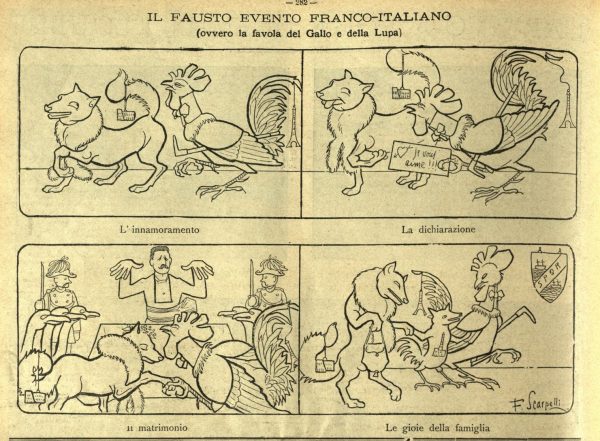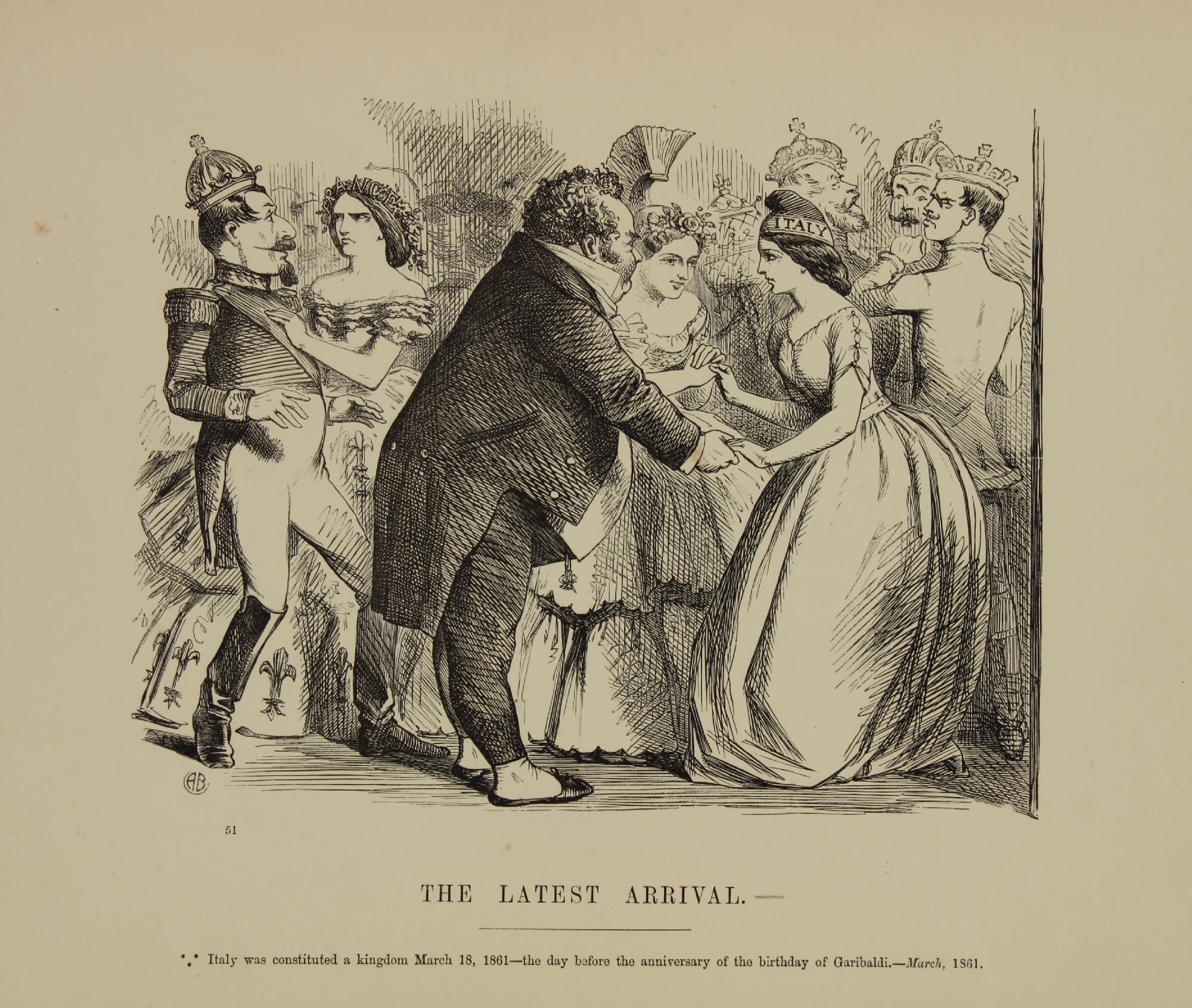Nella vignetta satirica del «Punch» è rappresentata l’Italia con berretto frigio sul capo. Sulla sinistra è presente la Francia, con sguardo torvo, di fronte a Napoleone III. In calce: “Italy was constitued a kingdom March 18, 1861 – the day before the anniversary of the birthday of Garibaldi. – March, 1861”.