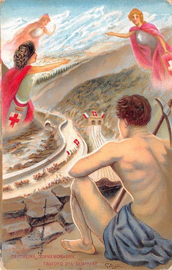Le allegorie femminili dell’Italia e della Svizzera si stringono la mano. I due paesi sono ora uniti dal traforo del Sempione.