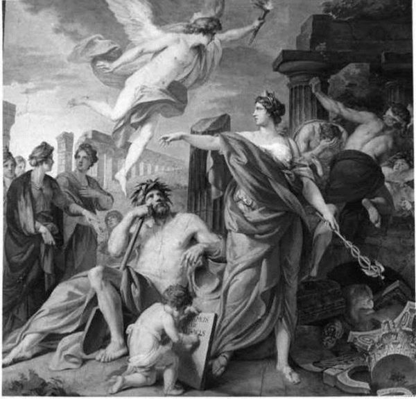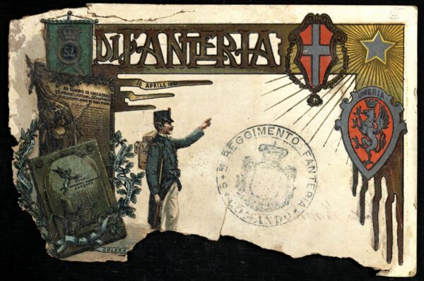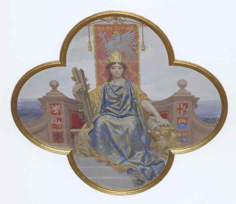 L’ allegoria femminile dell’Umbria ha il capo cinto da una corona turrita; alla destra è, inoltre, raffigurata una cornucopia; con la mano destra Umbria stringe a sé un fascio di rami d’olivo.