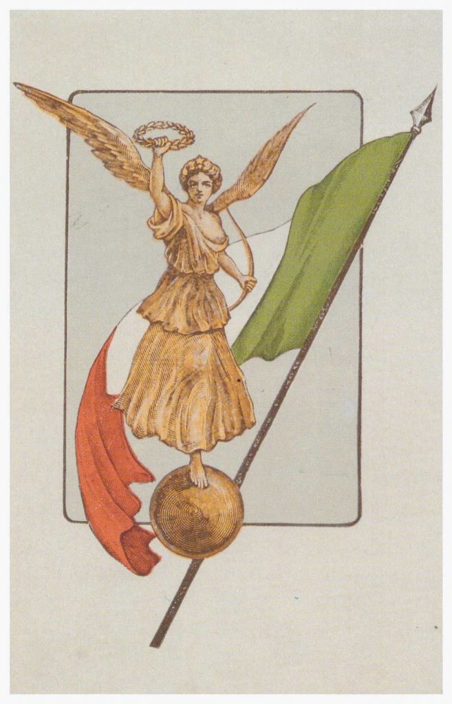 La Vittoria alata e stellata si erge in piedi su uno scudo, tenendo nella mano destra una corona d’alloro. Alle sue spalle sventola il tricolore italiano. Cartolina emessa dalla Banca Commerciale Italiana.