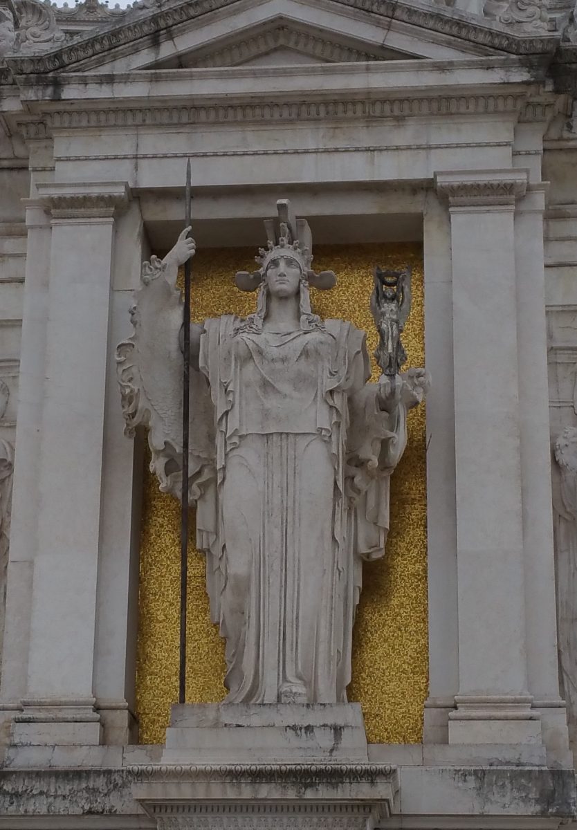 La statua della Dea Roma presso la sommità della scalinata del Vittoriano emerge da uno sfondo dorato e sottolinea la volontà dei patrioti italiani di avere Roma come capitale d’Italia.